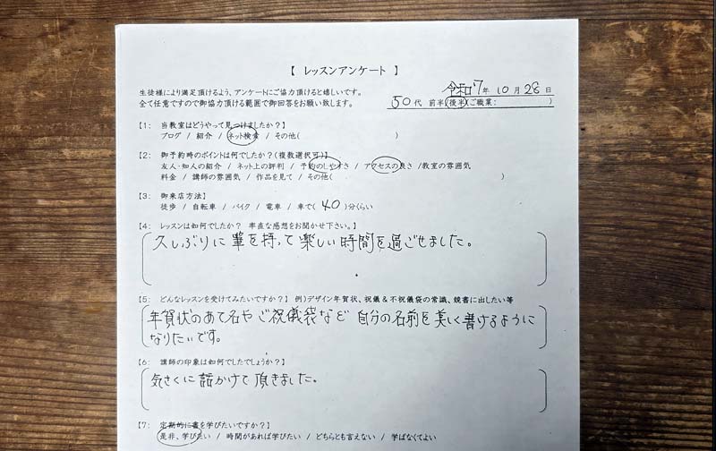 レッスンのご感想 久しぶりに筆を持って楽しい時間を過ごせました|中筆体験レッスンご感想