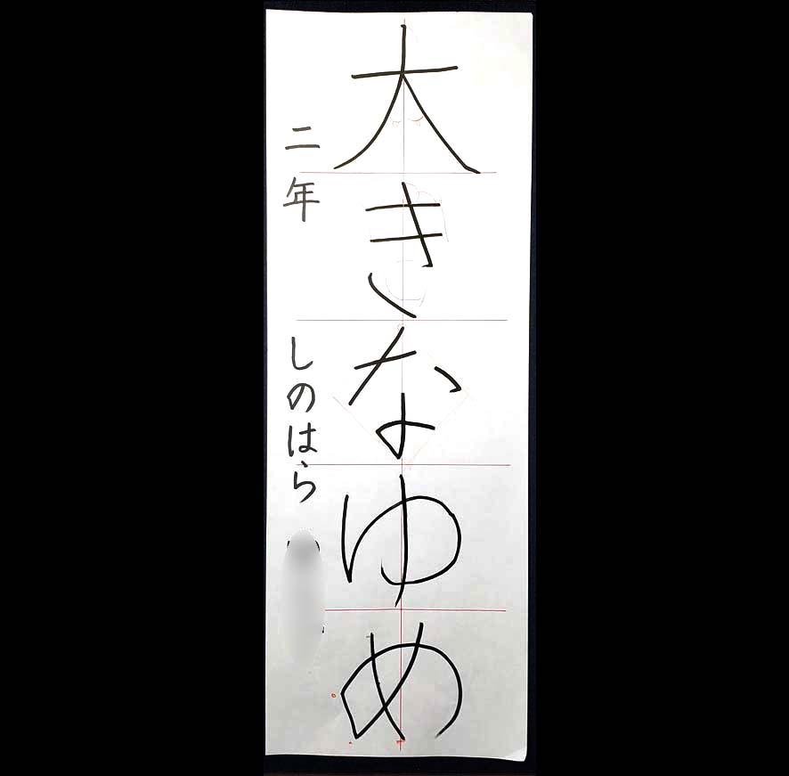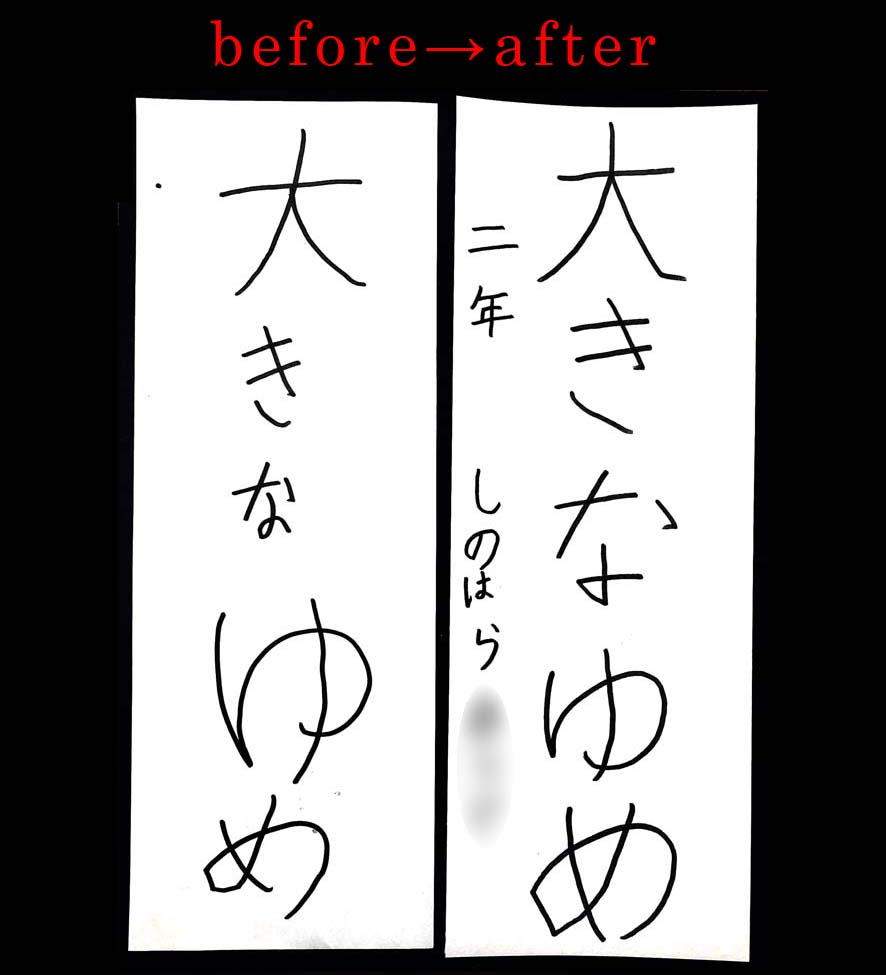 小学2年生の冬休みの宿題、書き初め「大きなゆめ」ビフォーアフター