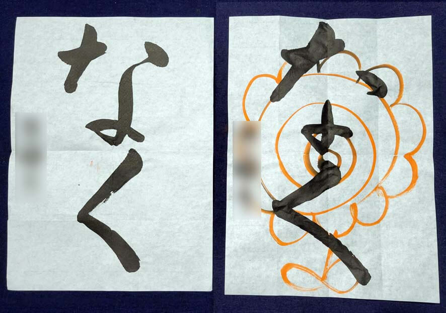 定期レッスンで平仮名の基礎に取り組んでいる生徒さんのビフォーアフター。