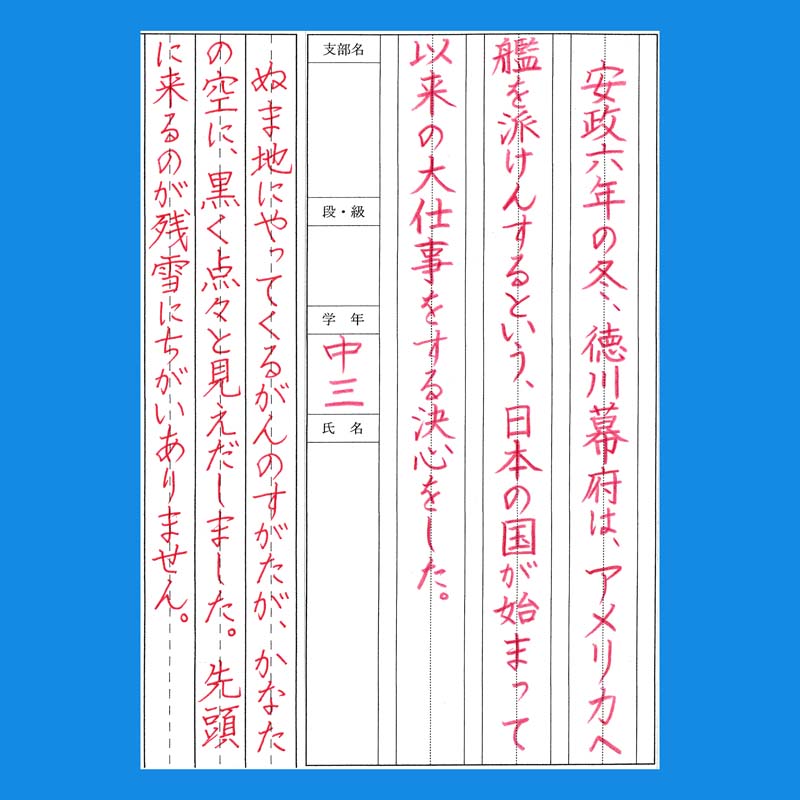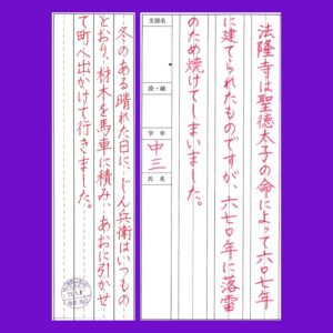 清書用紙に各マス目の中心線(点線)はありませんので、練習でマス目の真ん中に文字を書けるようにしていきましょう。