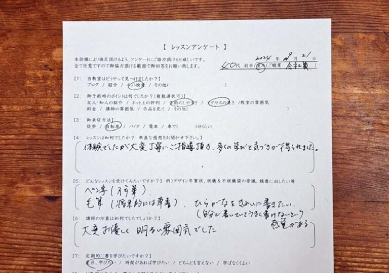 レッスンのご感想 色々な質問にもわかりやすくお答えいただき とてもよかった|硬筆体験レッスンご感想